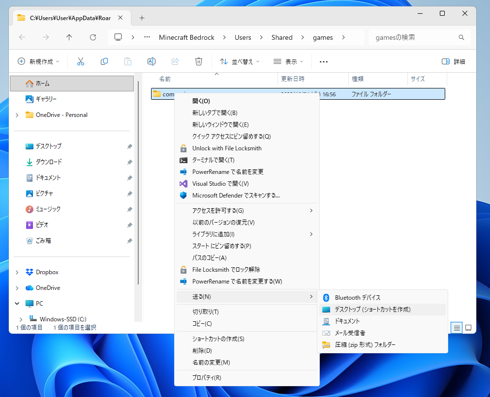 デスクトップにcom.mojang - ショートカットというファイルが作成されるので、次回からはそれをダブルクリックすることでcom.mojangフォルダを開くことができます。